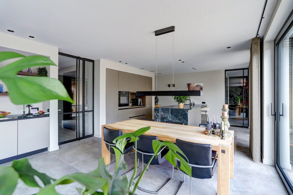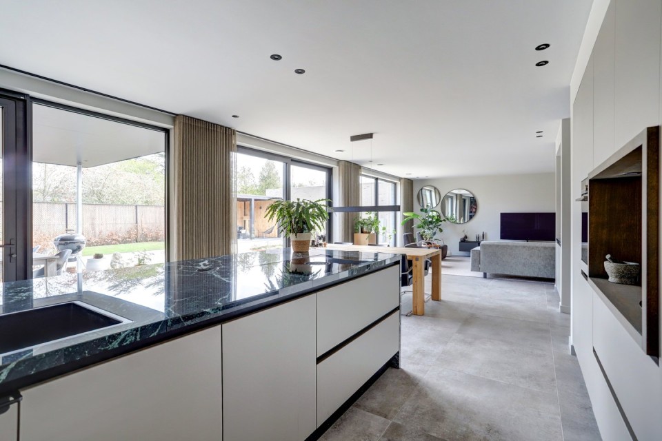 De woning is gebouwd met hoogwaardige materialen en een afwerking op niveau. Denk aan stalen taatsdeuren, HPL binnendeuren met luxe beslag en een doordacht lichtplan dat deels geautomatiseerd is. Vloerverwarming én vloerkoeling zorgen voor een aangenaam binnenklimaat gedurende het hele jaar.